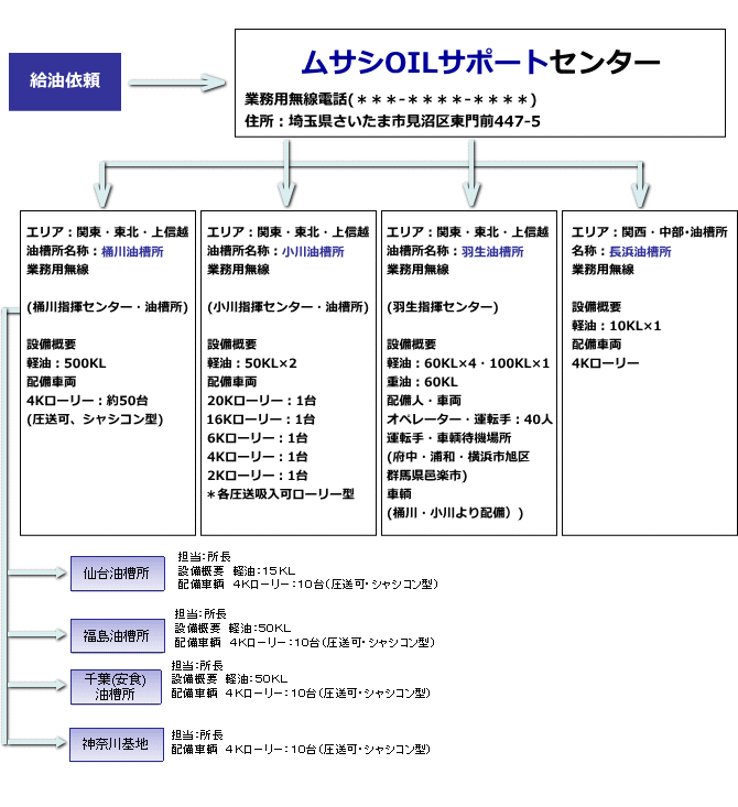 ムサシ産業では、ムサシ緊急給油システムによって、現状のリスクを分散し、より地域と密着し緊急時の対応を行うことにより、「確実かつ短時間・最短ルート」での燃料供給を実現いたします。